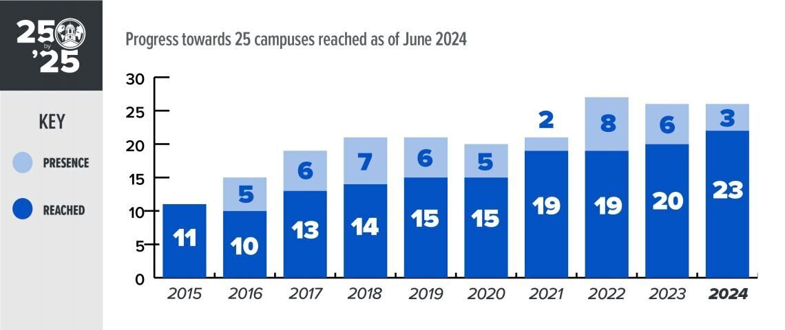 Since 2015, our ministry has had a 10 year goal to reach 25 campuses by 2025. Back then, this felt incredibly ambitious as we were only on 11 campuses. However, DiscipleMakers had a deep trust in the Lord to answer our prayers for this growth as we sought to make disciples on the college campus.