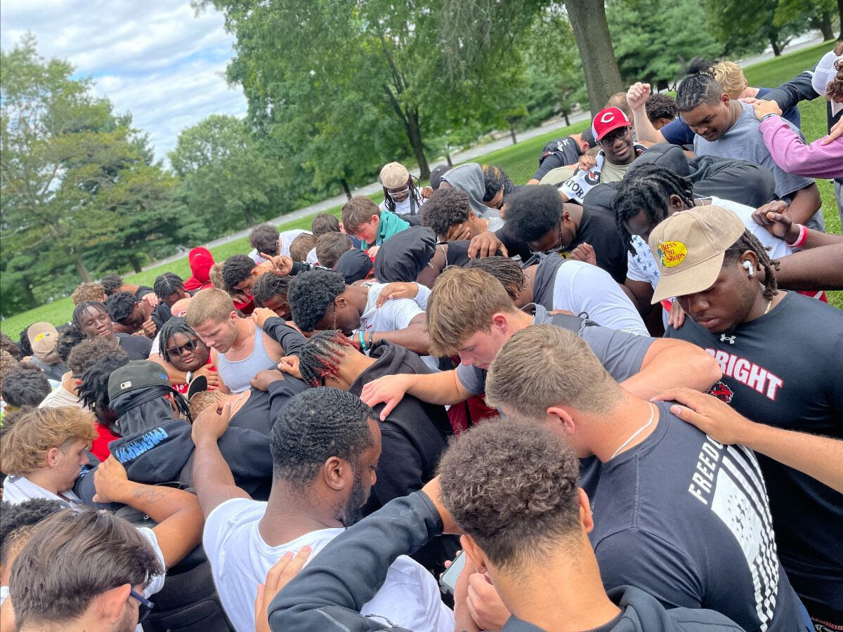 One of the players on the Albright football team gathering the team together, and praying over the team.