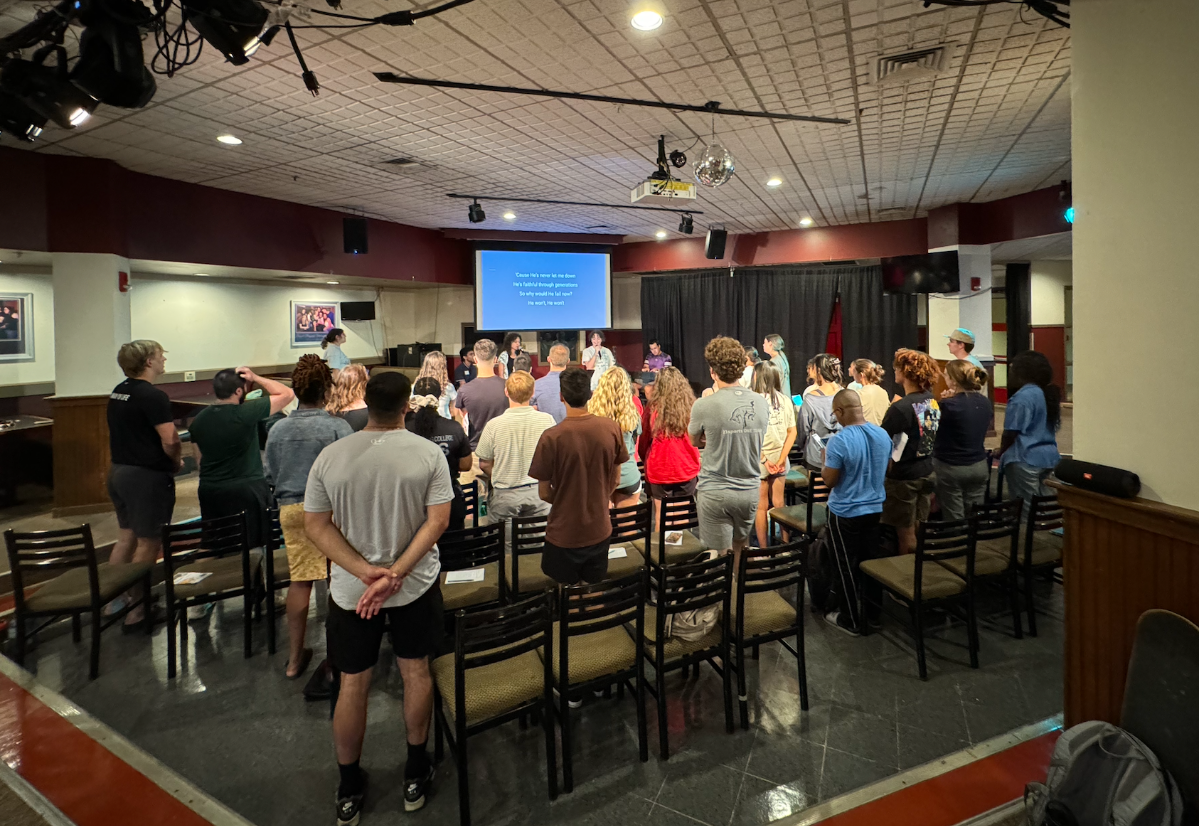 Students at Muhlenberg College, praising God in worship together at one of their first meetings.